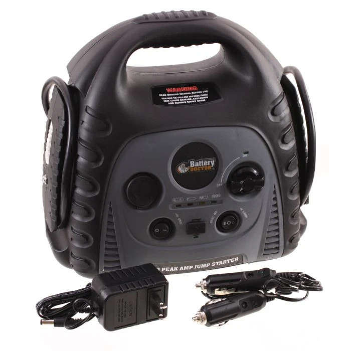 17 amp hour instant emergency jump starter. Includes a built in charger for recharging its internal battery, a 12V DC charging outlet, a USB outlet for charging portable devices and an ultra bright emergency work light.